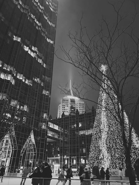 Last night, walking back from dinner in the cold, I take a turn and find myself at an ice skating rink, laughter following bundled bodies, orbiting a towering tree festooned in lights. It all reflects off of tall, mirrored buildings.