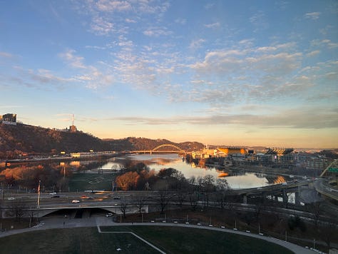 Outside my hotel room in Pittsburgh there is a confluence of three rivers and many bridges and overpasses. I’m here, gratefully and with fluctuating excitement, to help produce something large and absurd but E keeps reminding me that what we’re really doing is core experience curation, and I nod enthusiastically, there is a reason I have loved events in all their forms for so many years. While we’re here groups of us move from space to space, plotting our plans. Every time, someone will undoubtedly ask me where I’m from and I dance the matter as eloquently as I can. “Milwaukee” would be an easy answer, needing very little explanation, but I have a penchant for unnecessary details, a vie for connection and my own clarity. Cleveland no longer feels true, but that’s where we met! I offer, trying to constellate my belonging. “A retirement condo in Florida”, where we’ve been for the past month, feels ridiculous on my tongue.