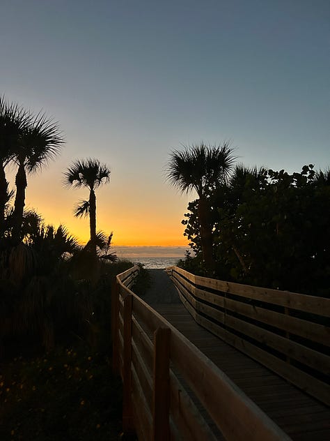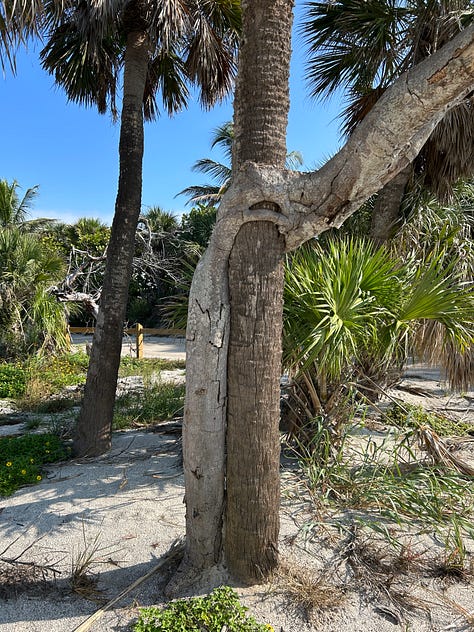 Surrounded by palm trees, an osprey circles. A red shouldered hawk calls again and again. A woodpecker lands in the gutter, red breasted and insistent. We go to the beach and I touch my fingers to the lapping waves and then to my lips. I find one shark tooth, my first, Lib finds fifteen, their glossy black surface piled into her cupped hand. On the table we arrange them and rearrange them, concentric circles, spirals, this is how I’m praying. I bow down again and again over the shell hash - where the tide pushes treasure into great piles, turning them over in the sand.